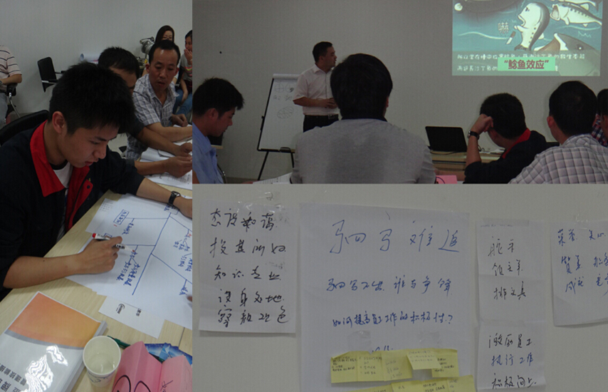 在培訓(xùn)中,祝勇老師分章節(jié)詳細(xì)地講述了管理與領(lǐng)導(dǎo)、溝通理念和方式、激勵(lì)方法與技巧、思維方式等理論。講述圖文并茂,案例豐富,在場的人員都聽得津津有味,并仔細(xì)記錄下對自己有幫助的理論與知識。培訓(xùn)采用競賽的方式,通過穿插在培訓(xùn)中的小游戲及互動(dòng)環(huán)節(jié),由老師觀察個(gè)小組成員的表現(xiàn)并給予相應(yīng)的積分獎(jiǎng)勵(lì),累計(jì)積分多的小組將獲得后的勝利。每組成員通過激烈的討論將自己的成果分享在教室四周的墻上。