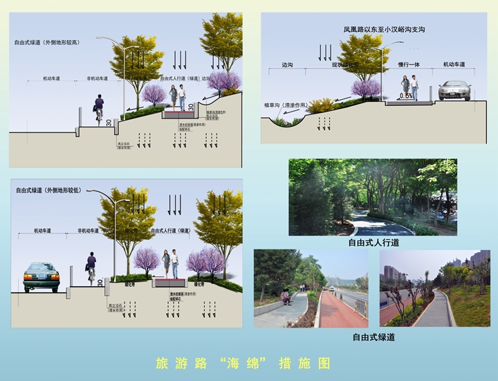 生態(tài)水塘下鋪設(shè)了60cm碎石促滲層,既加速了雨水下滲,同時(shí)也提高了蓄水能力。生態(tài)水塘內(nèi)種植了蘆葦、菖蒲、千屈菜、花葉蘆竹等水生植物,橋臺(tái)護(hù)坡進(jìn)行了疊石壘砌樹池處理,種植了木槿、紫薇等花灌木,改變了原來石砌護(hù)坡裸露的灰色形象。通過實(shí)施一系列海綿設(shè)施改造建設(shè),不僅大大緩解了旅游路雨水系統(tǒng)壓力,而且極大改善了該區(qū)域生態(tài)景觀環(huán)境,實(shí)現(xiàn)了工程建設(shè)綜合效益提升。