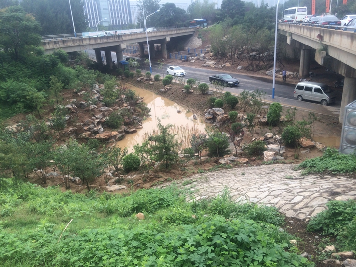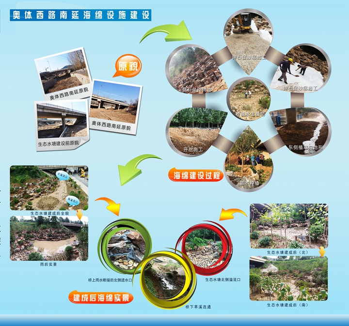 奧體西路南延原為斷頭路,道路紅線范圍及東西側(cè)空間原狀均為荒地,旅游路北橋北側(cè)原為大辛河支溝上游河道。結(jié)合本次奧體西路南延道路工程建設(shè),充分落實(shí)海綿城市建設(shè)理念,重點(diǎn)對(duì)橋下空間因地制宜進(jìn)行挖潛,精心設(shè)計(jì)建設(shè)了1500余平方的生態(tài)水塘、植草溝、旱溪等海綿工程設(shè)施。通過對(duì)旅游路部分路段雨水進(jìn)行斷接,使上游區(qū)域雨水先進(jìn)入生態(tài)水塘等設(shè)施進(jìn)行生態(tài)凈化和下滲,滲后多余的雨水再溢流進(jìn)入大辛河支溝,徹底改變了該路段原有的雨水直排模式。