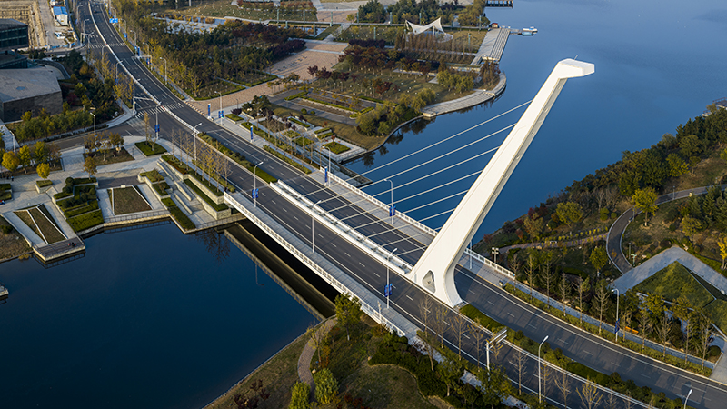匯智橋路南、北橋均為無背索獨塔單索面斜拉橋,橋跨 82 米,全寬 33.5 米;智力島路橋為單跨新型斜靠式拱