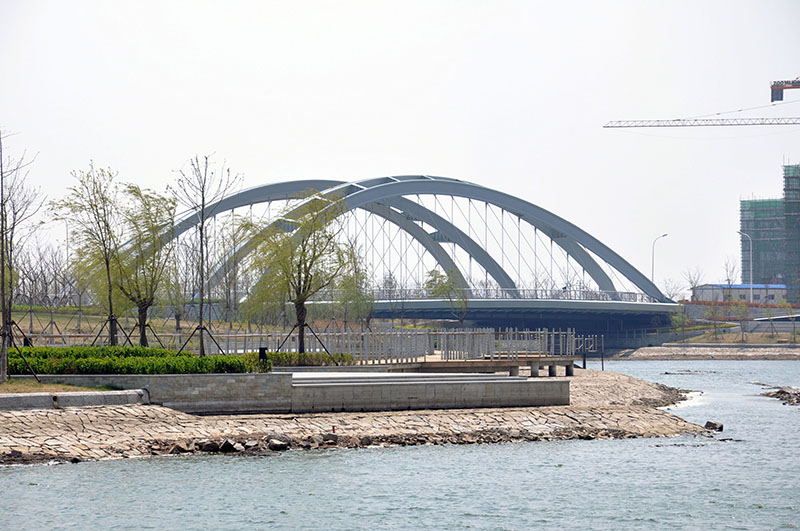 16.5+59+16.5=92 米,寬度 30 米;聚賢橋路北橋為斜腿剛構橋,橋跨組合為 21+28+21=70 米,寬度 30 米。